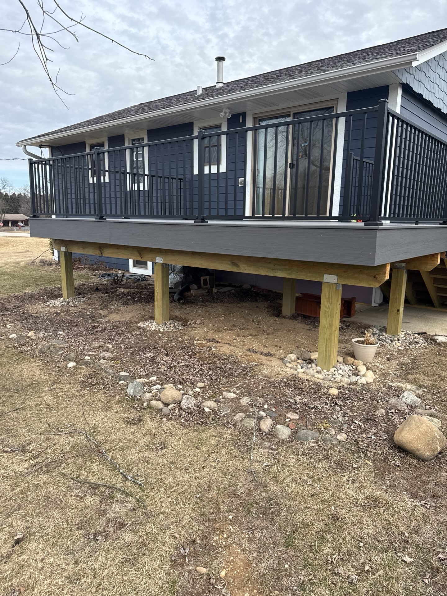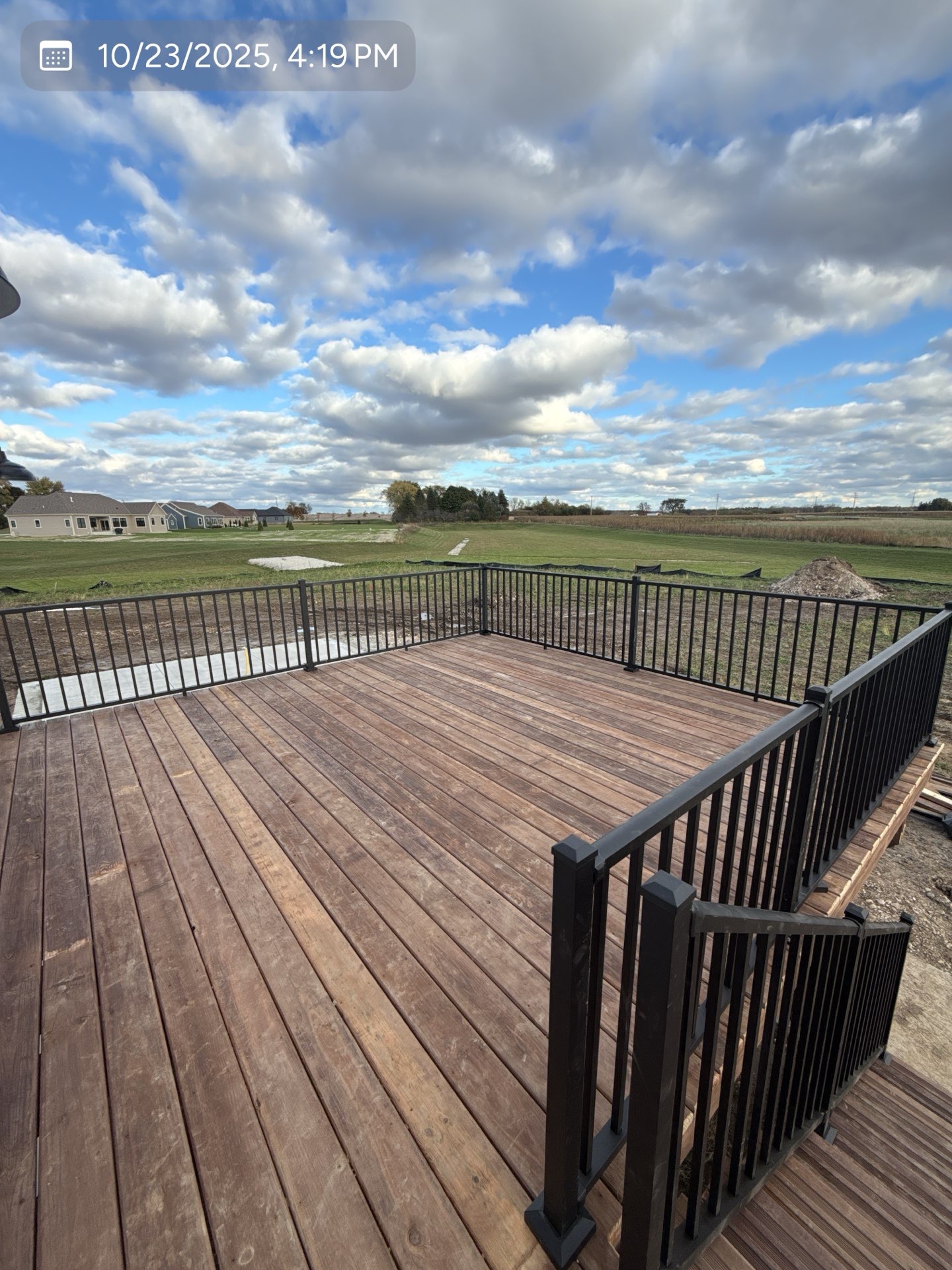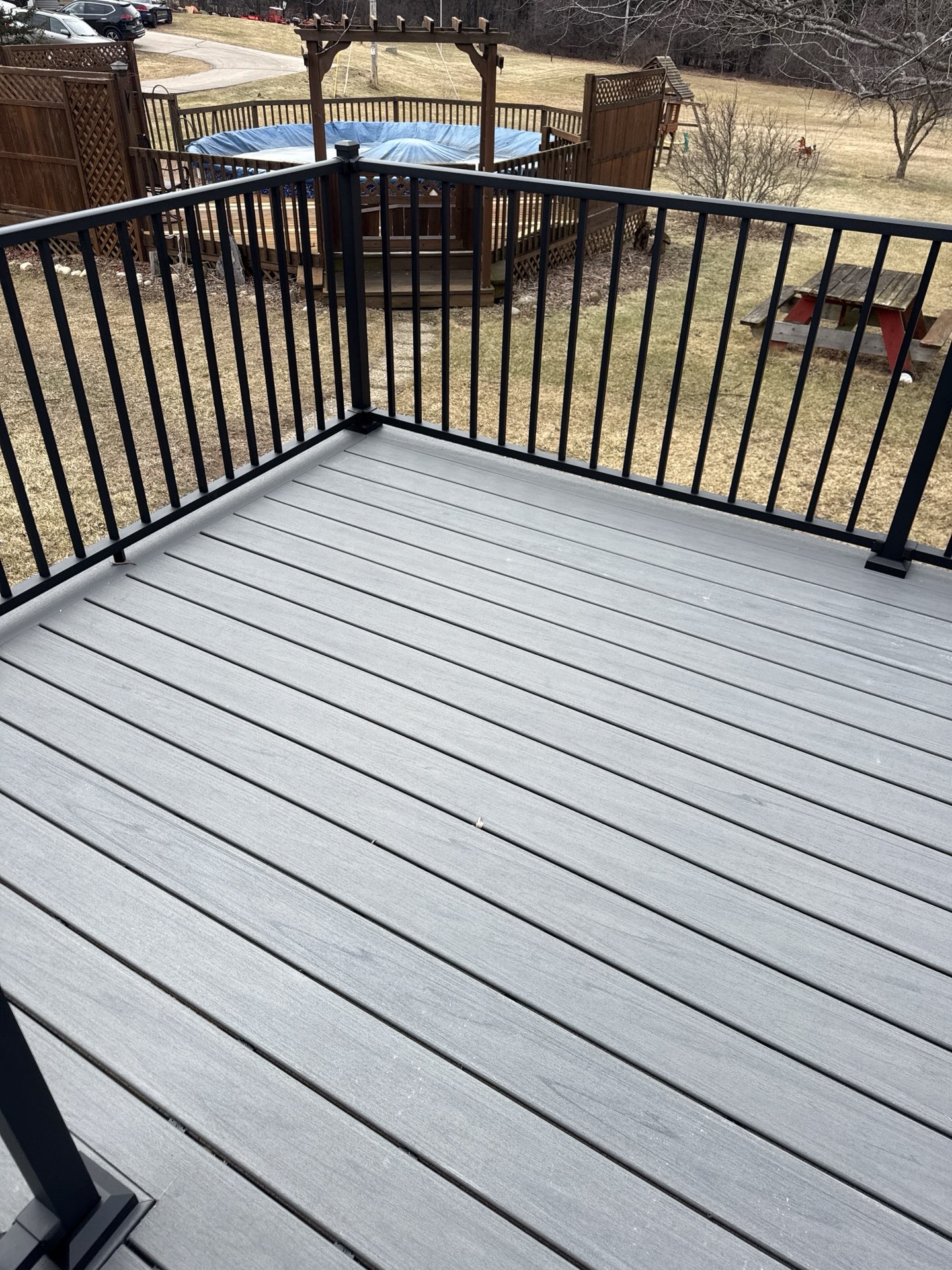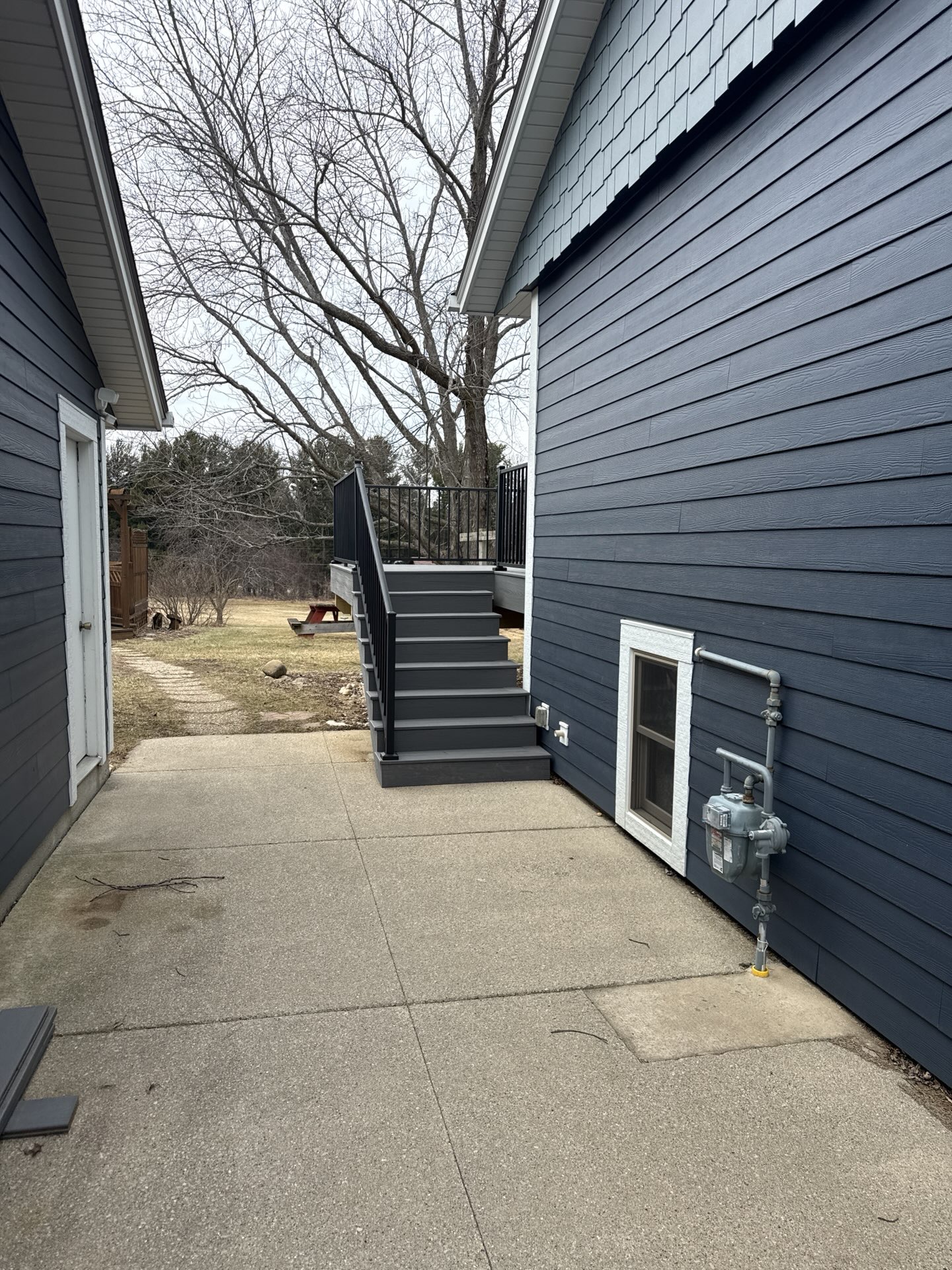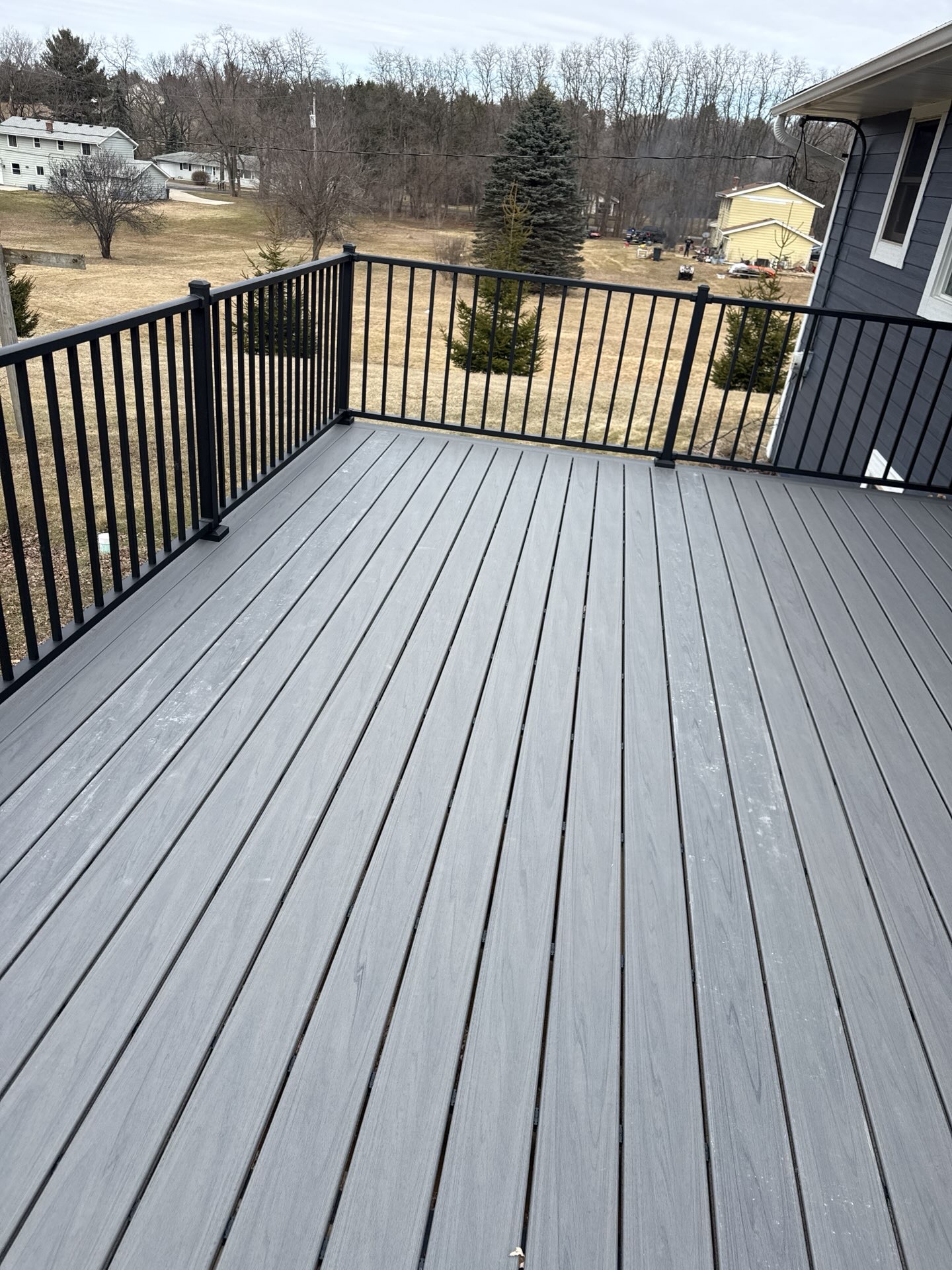 New Cedar Tone Deck with Aluminum railings. Concrete patio