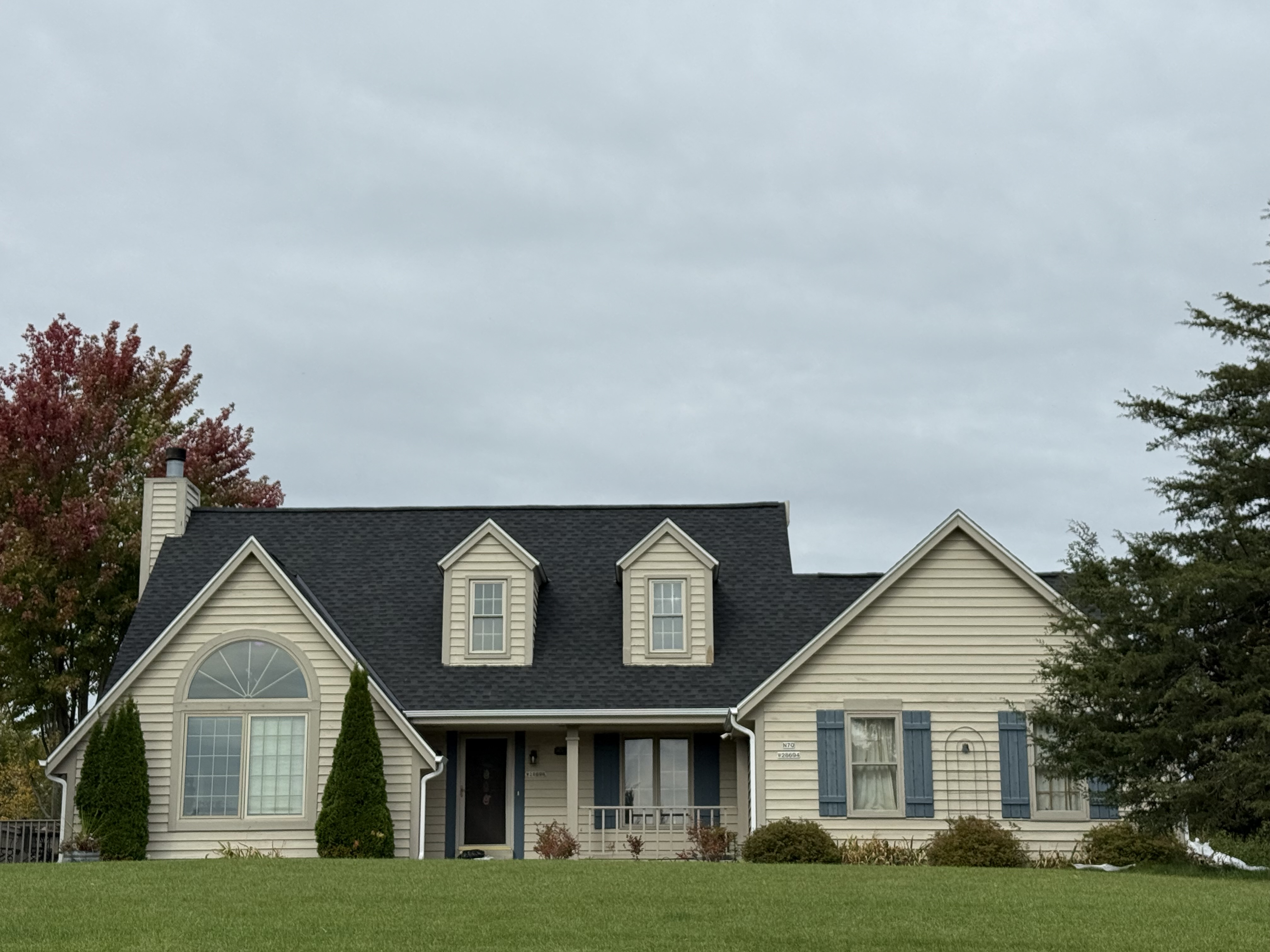 New GAF HDZ charcoal roof and skylights. White gutters and downspouts